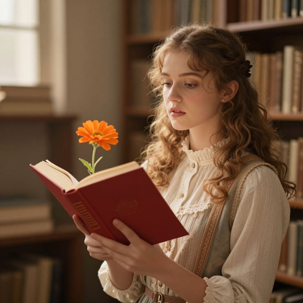 Photograph of a young Caucasian woman with fair skin and long, wavy brown hair, wearing a cream-colored, high-collared blouse with puffed sleeves and beige suspenders. She's holding an open red book, gazing at an orange marigold flower held in her other hand. The background shows a sunlit library with wooden bookshelves filled with books, creating a warm, nostalgic atmosphere. Soft light from a window illuminates her face, highlighting her thoughtful expression. The image has a vintage, romantic style, emphasizing the serene and intellectual mood.