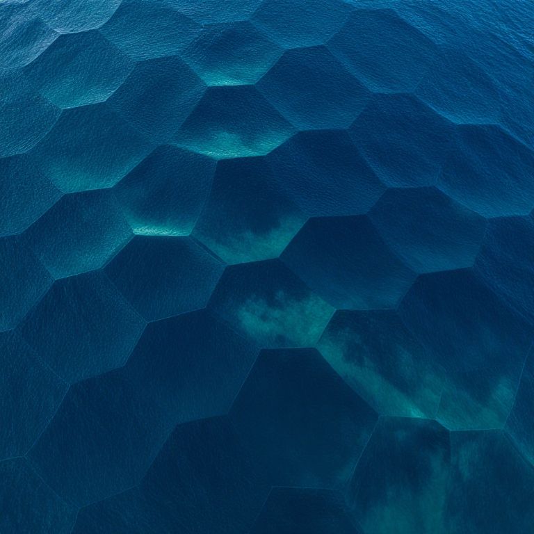 Aerial view of geometric ocean waves with layered hexagonal patterns, deep blue and teal color palette, stylized and futuristic look, high detail and contrast