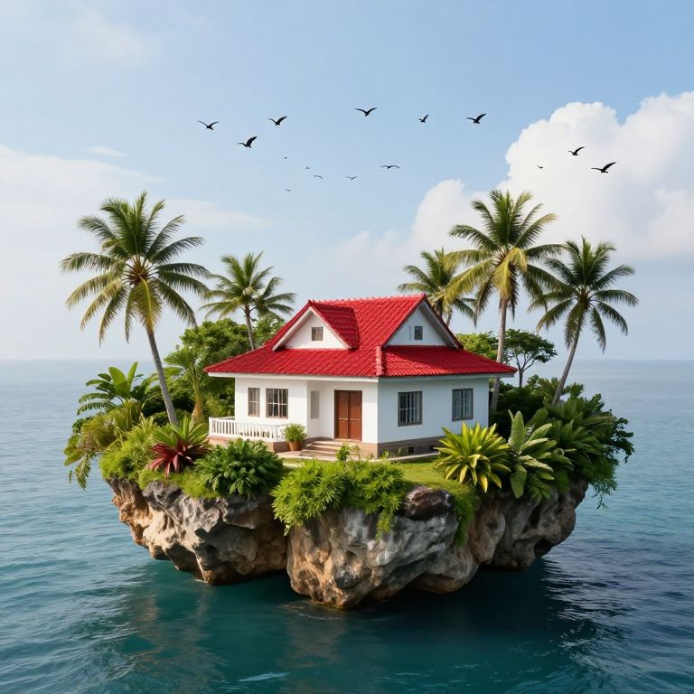 Serenely perched above the tranquil ocean, a quaint white house with a red-tiled roof sits atop a lush, floating island, surrounded by vibrant greenery, palm trees, and a scattering of birds soaring through the sky.