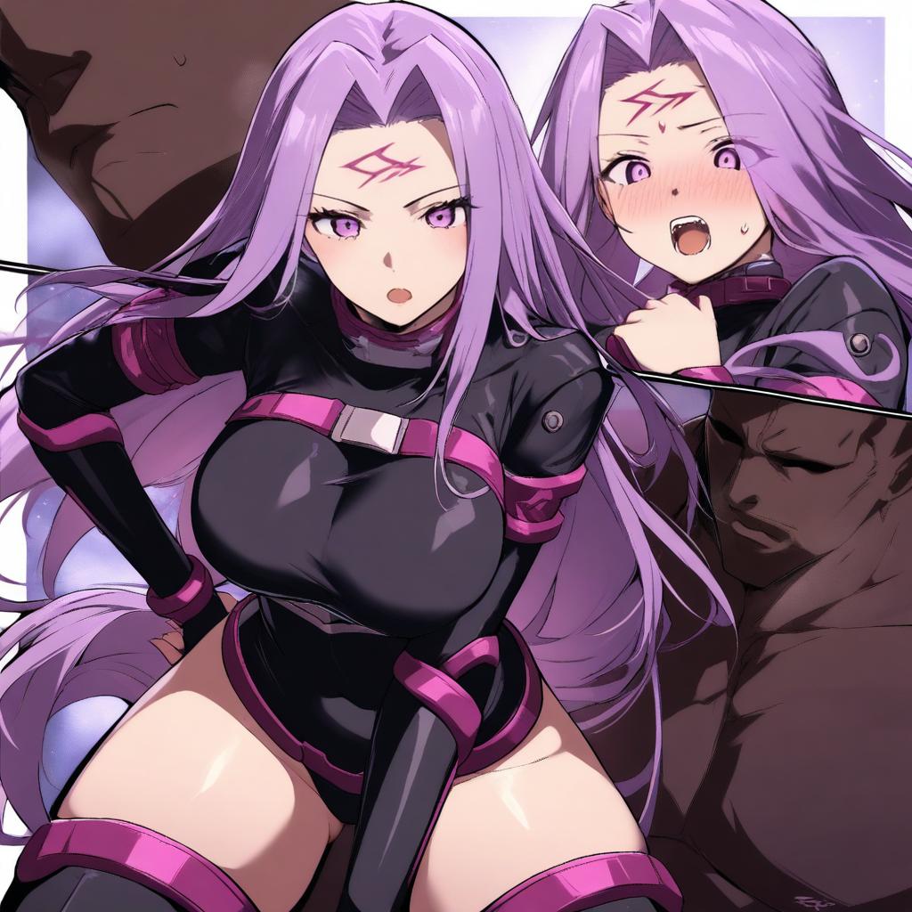 Swf, SFW, medusa_rider_fate,1girl,long hair,purple hair,thighhighs,purple eyes,open mouth,forehead mark,blush,darkskinned male,dark skin,facial mark