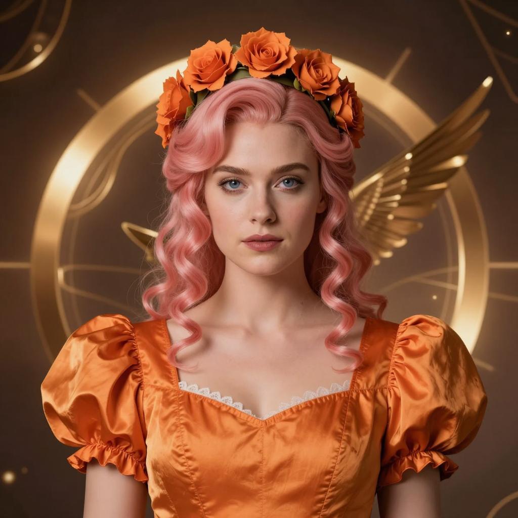 Photorealistic image of a young Caucasian woman with dark brown wavy hair wearing an emerald green strapless dress with a gold chain belt. She has green face paint around her eyes and stands centered in front of a large feather-like green backdrop. The composition is symmetrical, with a fantasy and ethereal mood, highlighting vibrant shades of green.