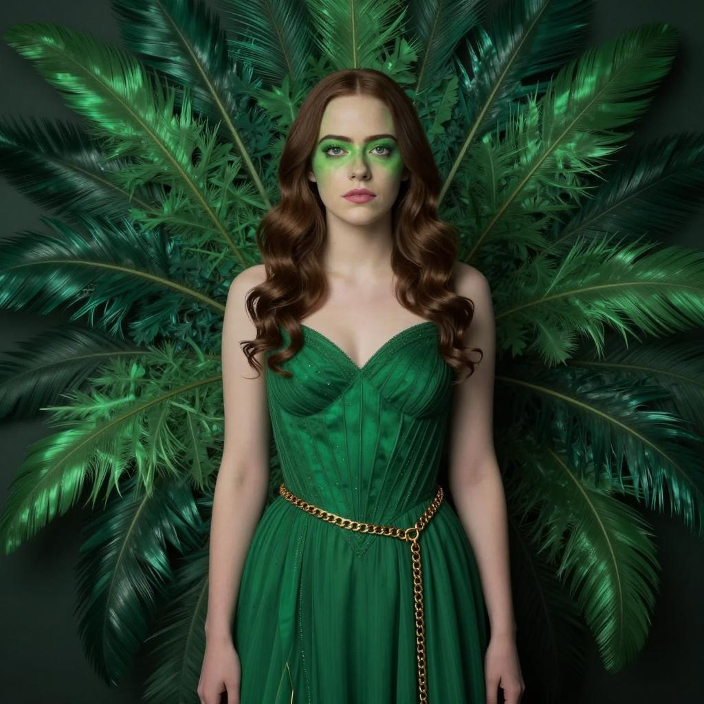 Emerald city theatrical, photorealistic, Emma Stone, standing, centered, wearing green dress with gold chain belt, feather-like green backdrop, dark brown wavy hair, green face paint, serious expression, detailed ures, digital art, fantasy theme, vibrant colors, symmetrical composition, ethereal mood