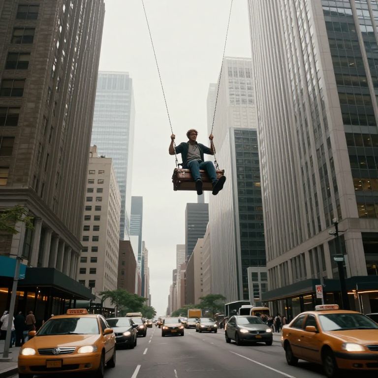 Photograph of a bustling urban street in a city with tall, modern skyscrapers on both sides. A man, dressed in a black t-shirt and jeans, is suspended mid-air by ropes, sitting on a swing between two buildings. Yellow taxis fill the street below, while pedestrians walk along the sidewalks. The sky is overcast, and the buildings' glass windows reflect the city lights. The scene combines elements of urban life and whimsical adventure.