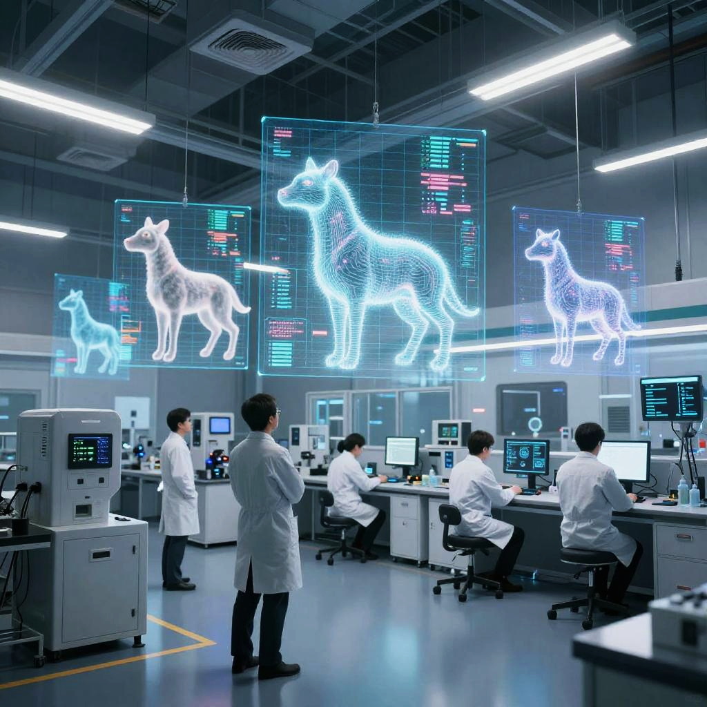 Scene of an animal AI generator lab, multiple animal holograms forming simultaneously, holographic data grids, futuristic scientists observing, sophisticated AI machinery with digital displays, cool-toned color scheme, high detail, sci-fi ecosystem creation
