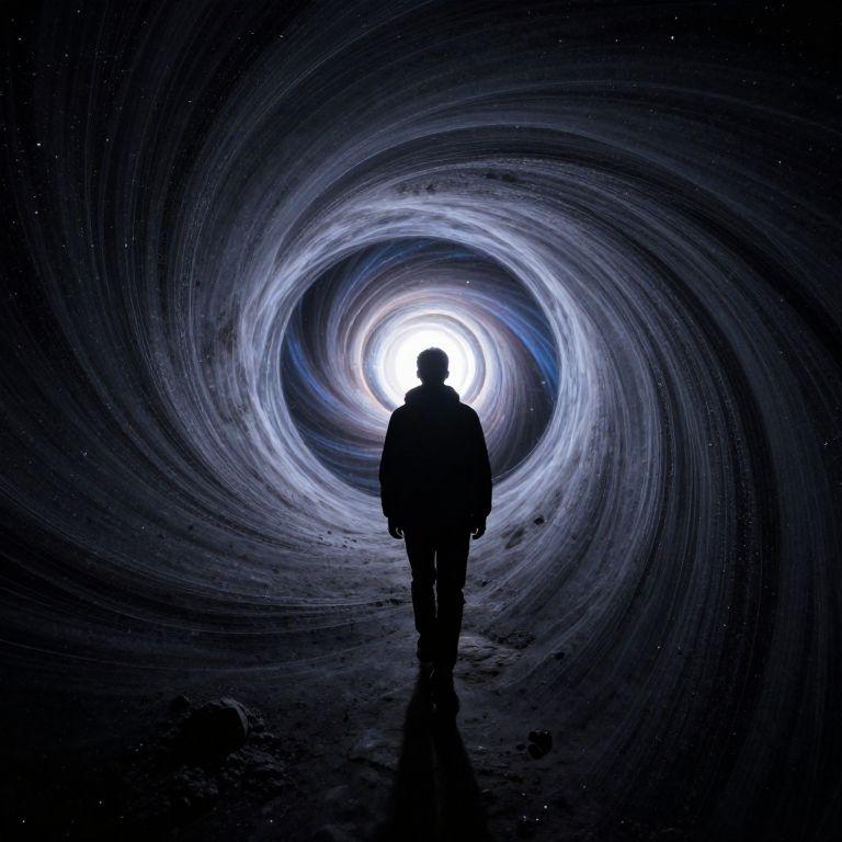 An eternal journey unfolds within the embrace of a cosmic tunnel, where each step ascends toward radiant hope and descends into the depths of introspection, inviting the soul to transcend the boundaries of existence.