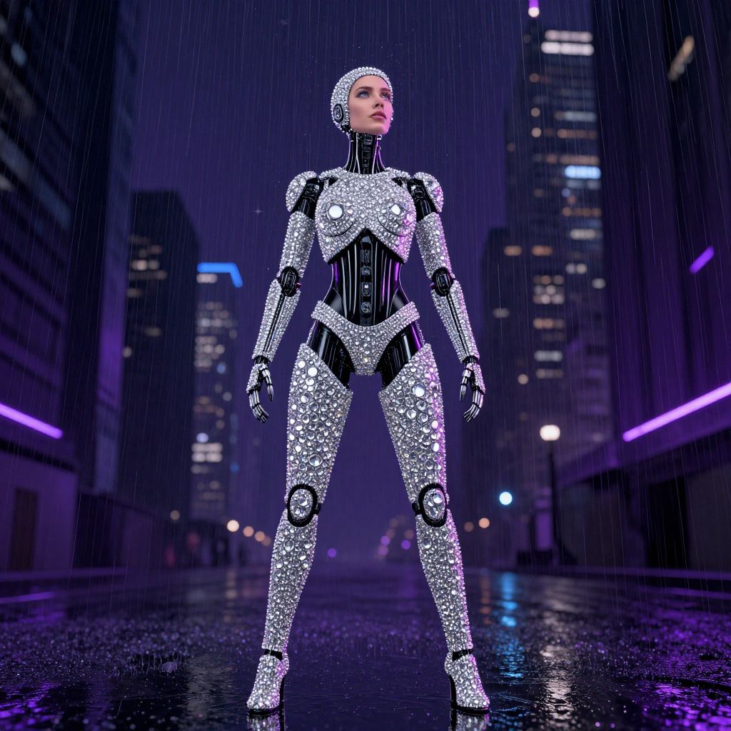 Panning woman cyborg with diamonds all over standing in the rain full body, looking up, dark city, purple blue lights,8k,