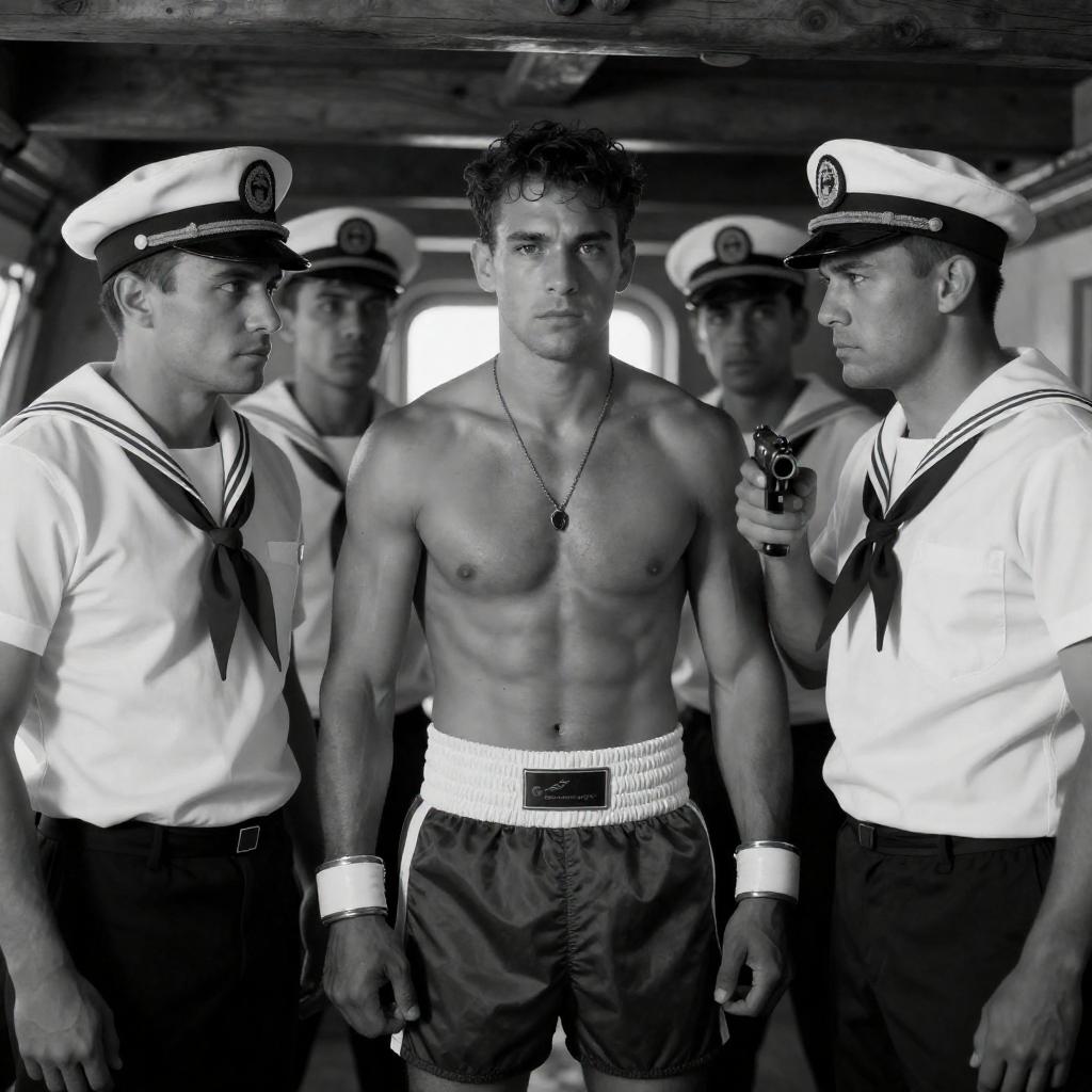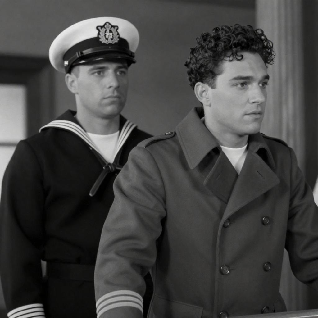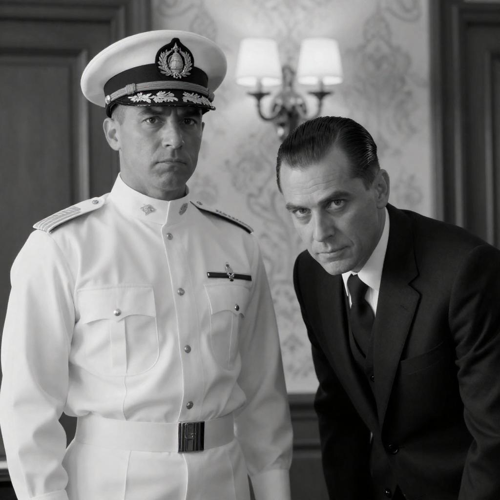 Black and white photograph of two male naval officers in uniform standing beside a large box containing a woman with long, fluffy hair. Both officers have serious expressions, one resting his chin on his hand. The woman lies inside the box, head turned to the side. Background includes dim lighting and indistinct objects.