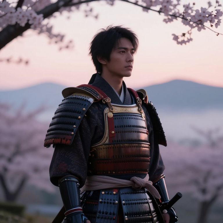Kunichi depicted as a serene warrior in traditional Japanese armor standing amidst cherry blossoms at dawn, soft ambient light highlighting intricate details on armor, a misty mountain background blending with soft pastel skies.