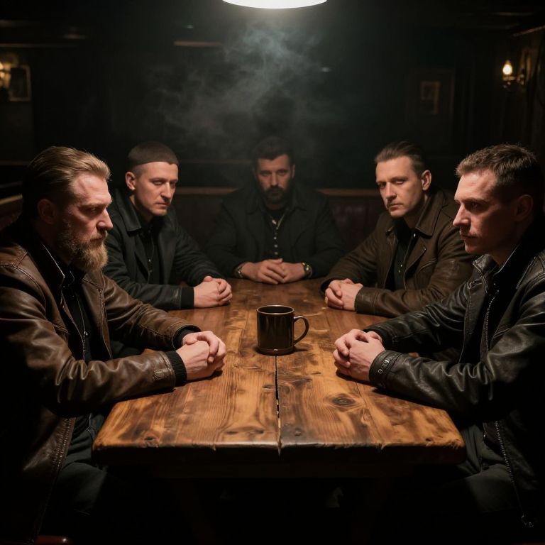 Bratva gathering around a rustic wooden table in a dimly lit underground club, smoky atmosphere, Russian mafia aesthetics, vintage furniture, tense expressions, heavy shadows, dramatic cinematic lighting, ultra-realistic textures.