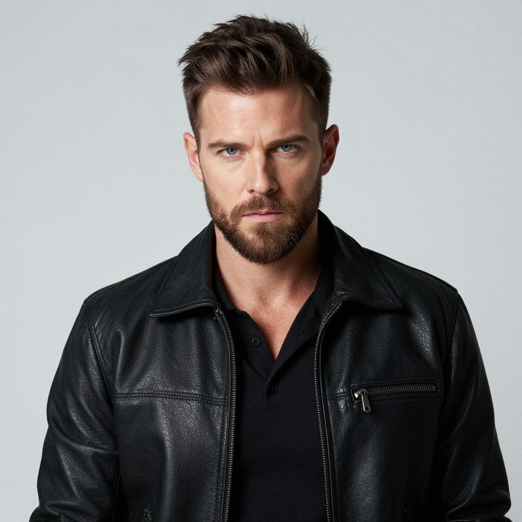 Photograph of a handsome, bearded white man with short, dark brown hair and intense blue eyes. He's wearing a black leather jacket over a black shirt, with a small zipper pocket on the left side of the jacket. The background is a plain, light gray, making him the clear focus. His expression is serious and confident, and the lighting highlights the texture of his leather jacket.