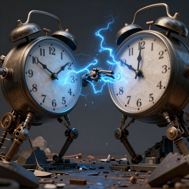 In a surreal clash of time, two colossal clocks stand frozen in a battle of existential tension, their mechanical arms striking with bolts of electric blue static, symbolizing the relentless conflict between past and present, while the scattered debris below whispers of the transient nature of moments.