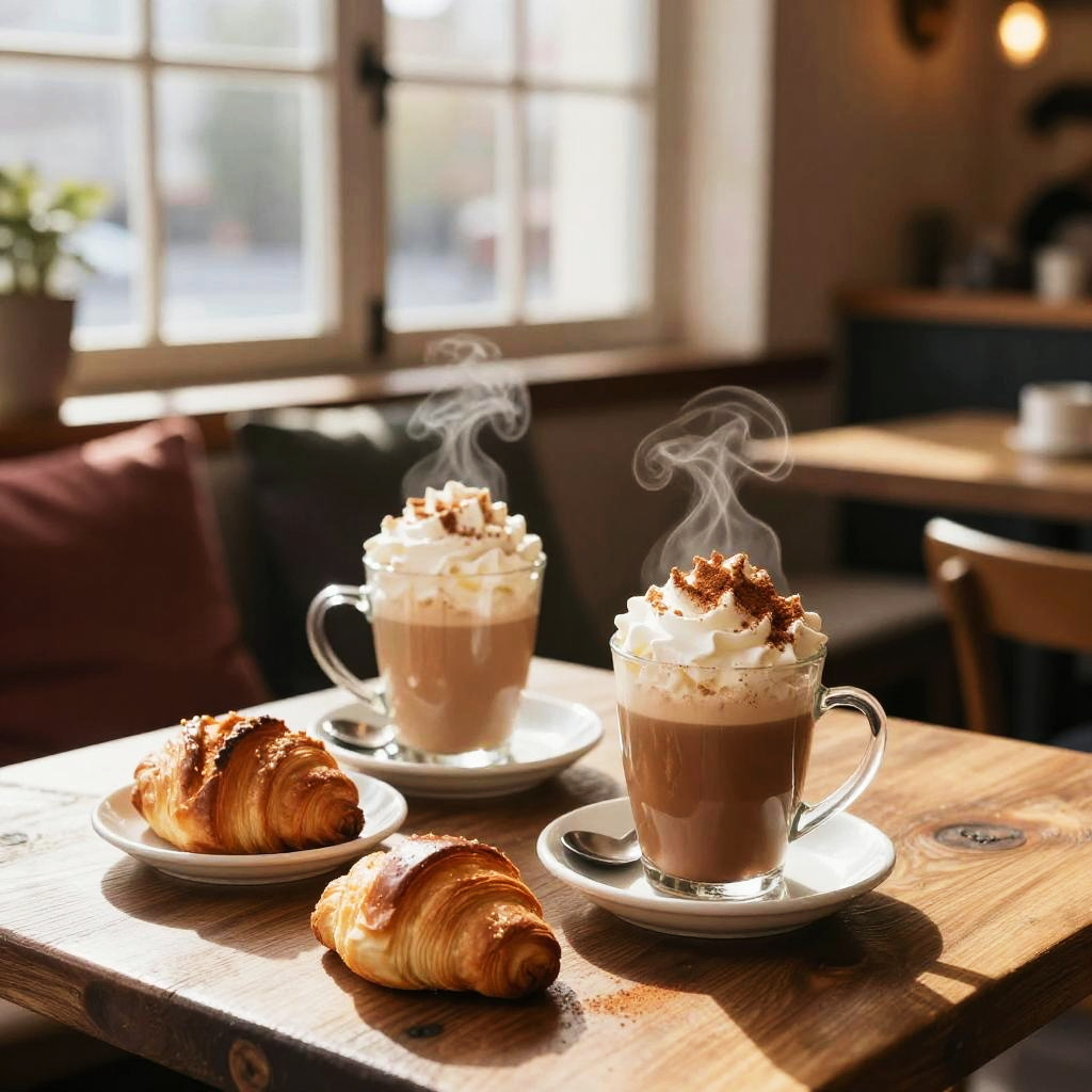 Photograph of a cozy café scene. Sunlight streams through a window in the background, illuminating a wooden table. On the table, two steaming mugs of chocolate milk topped with whipped cream and chocolate shavings sit on white saucers. In front of the mugs, two golden-brown croissants rest on a plate. The café has a rustic ambiance with dark wooden chairs and a soft, warm light. A blurred potted plant and other indistinct objects are visible in the background, enhancing the inviting, warm atmosphere.