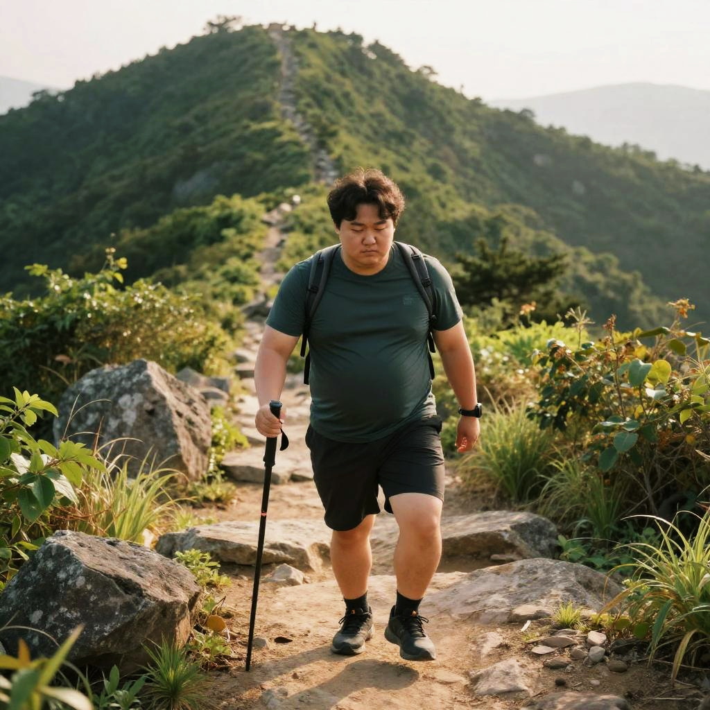 Chubby Korean man hiking on mountain trail, scenic natural landscape with lush greenery, morning sunlight, sporty outfit, determined expression, detailed textures on rocks and foliage