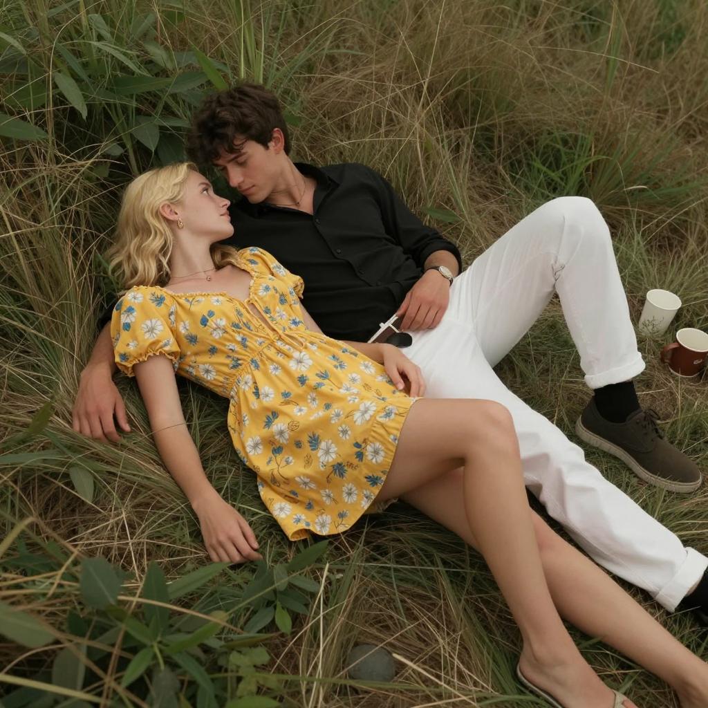 Photograph of two people sitting on a rooftop near overpass structures. Man with brown coat, red shirt, and brown hair, eating. Woman with blonde hair, red plaid shirt, green pants, eating from red box. Clear blue sky, mountain background. Woman sitting with legs up, man sitting down. Both focused on eating.