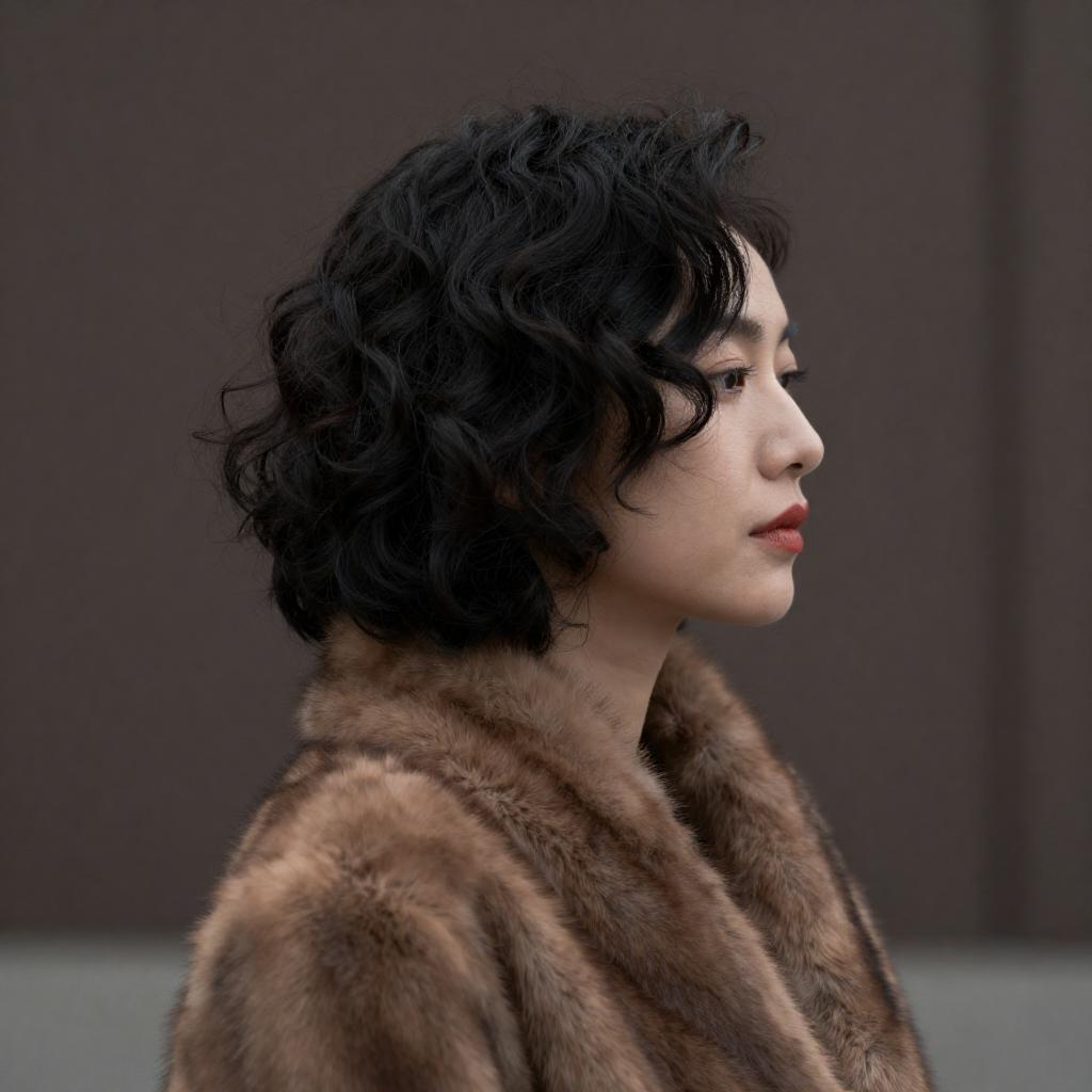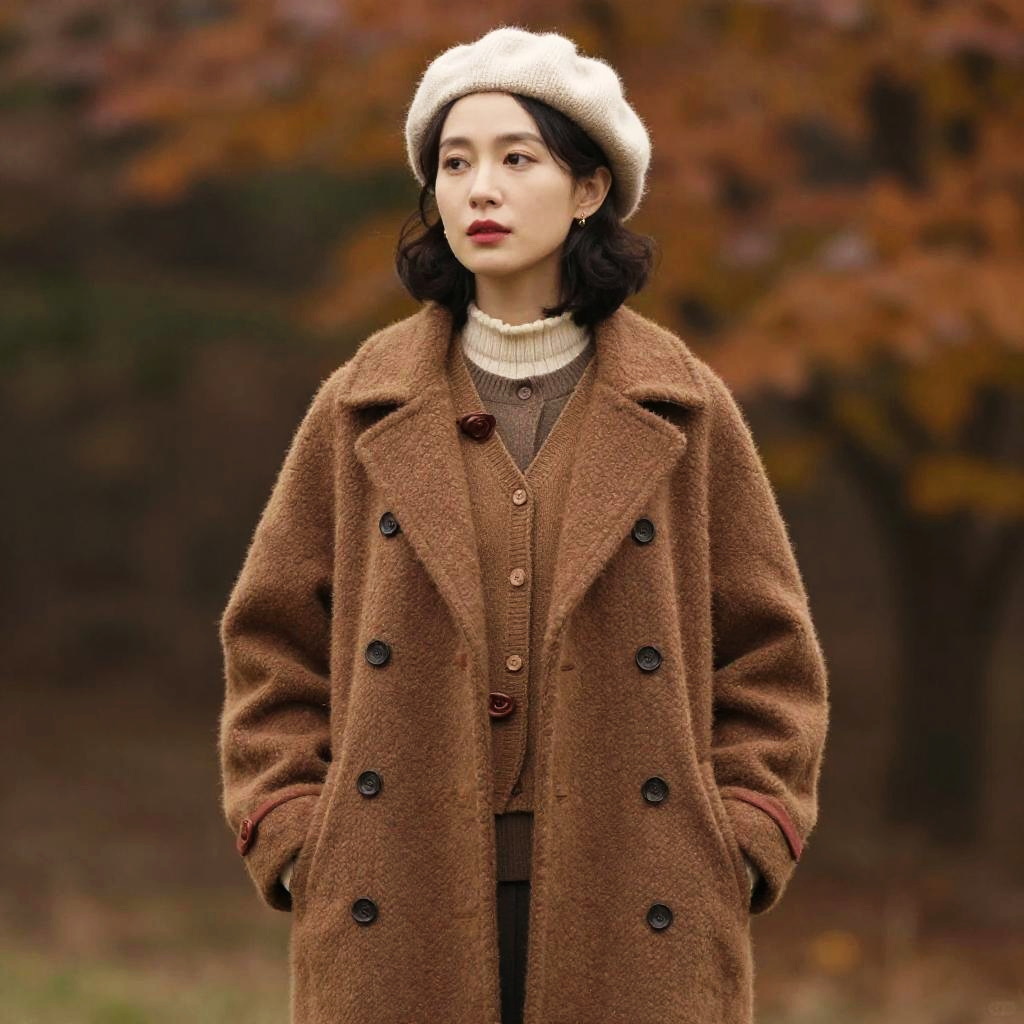 A woman dressed in a vintage cozy fall outfit featuring a knitted beret and a textured brown coat stands against a backdrop of autumn foliage. The cinematic realism style captures the serene autumn atmosphere, highlighting her warm and stylish layered clothing.