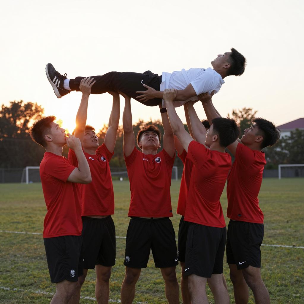 A group of seven male athletes on a grass sports field during evening light, lifting a man dressed in a white shirt and black pants into the air. Six athletes wear matching red jerseys and black shorts. The background shows silhouetted trees against a setting sun, emphasizing dynamic teamwork and intense expressions among the players.