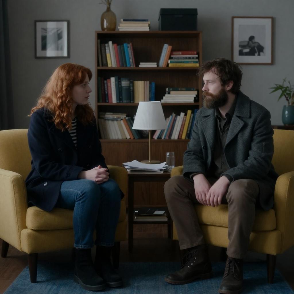 Photograph of a wood-paneled room. A bearded man in a beige jacket and khaki pants stands facing a woman with shoulder-length brown hair in a dark green coat. They hold hands. Sunlight streams through a small window behind them. Shelves, a stove, and a white stool are in the background. Both have neutral expressions.