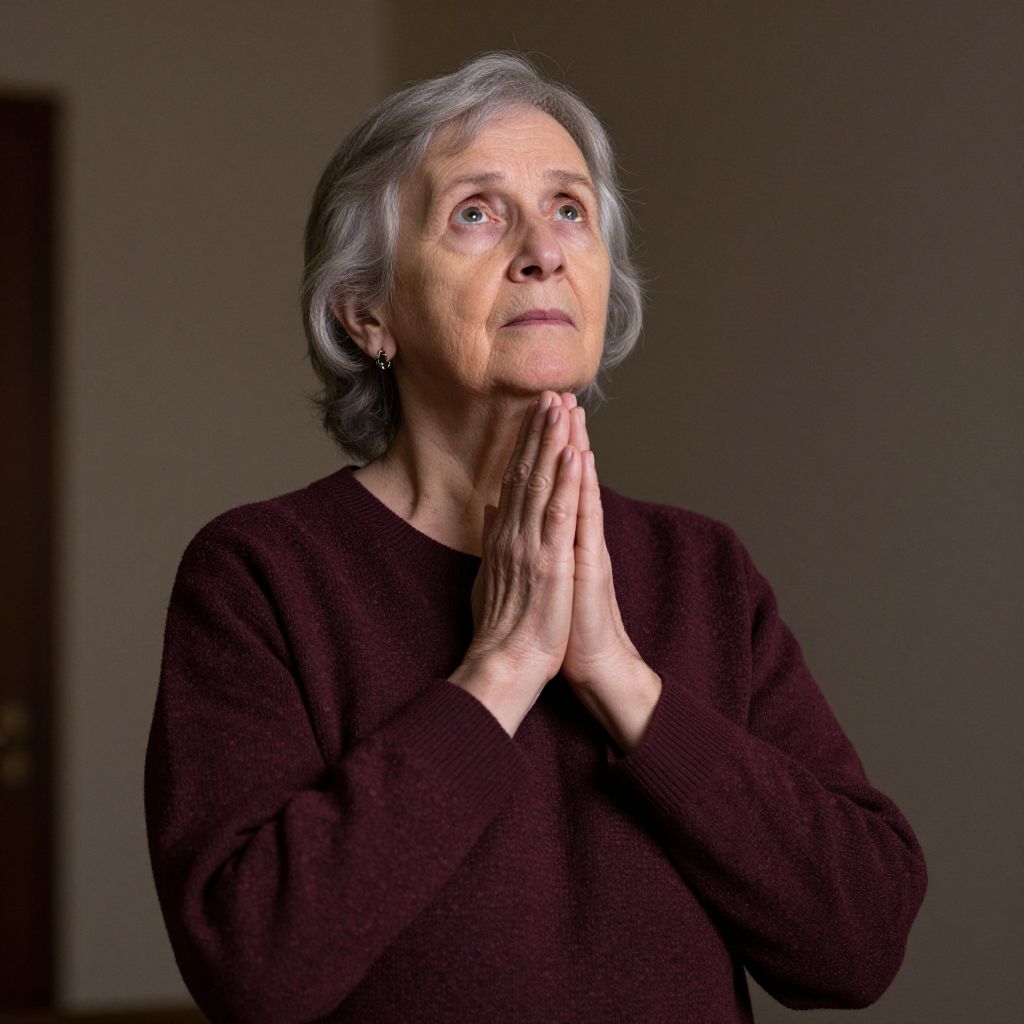 Elderly woman with gray hair, wearing a maroon sweater, stands with her hands clasped in prayer, her gaze directed upward in a moment of contemplation and reflection.