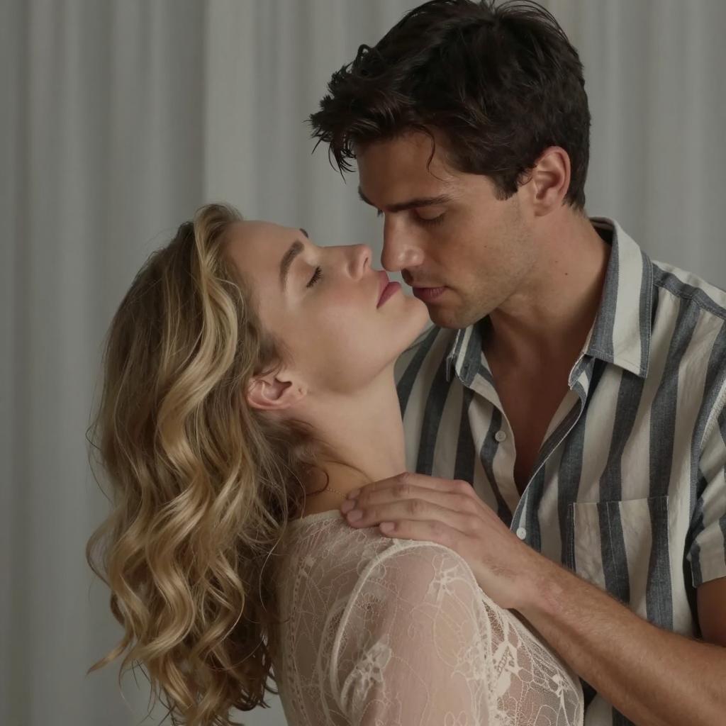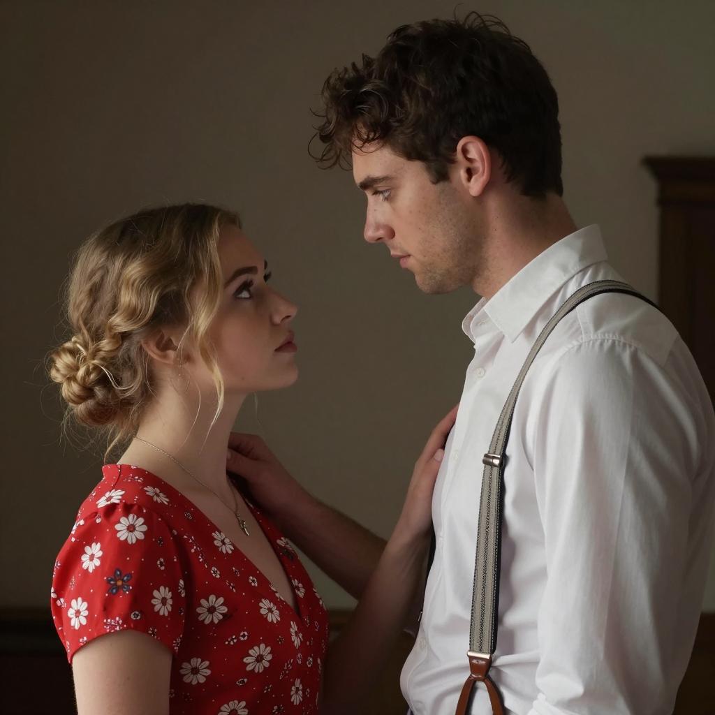 A young couple in a dimly lit room. Woman with light skin, blonde hair in a bun, wearing a red dress with white floral patterns, looking up at the man. Man with light skin, dark brown hair, wearing a white shirt with gray suspenders, looking down at her, hand on her shoulder. Both have intense, focused expressions. Dark background.