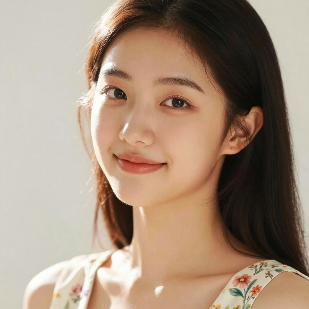 Photograph of a smiling Asian woman with long black hair, touching her cheek, wearing a white top, surrounded by colorful flowers at sunset.