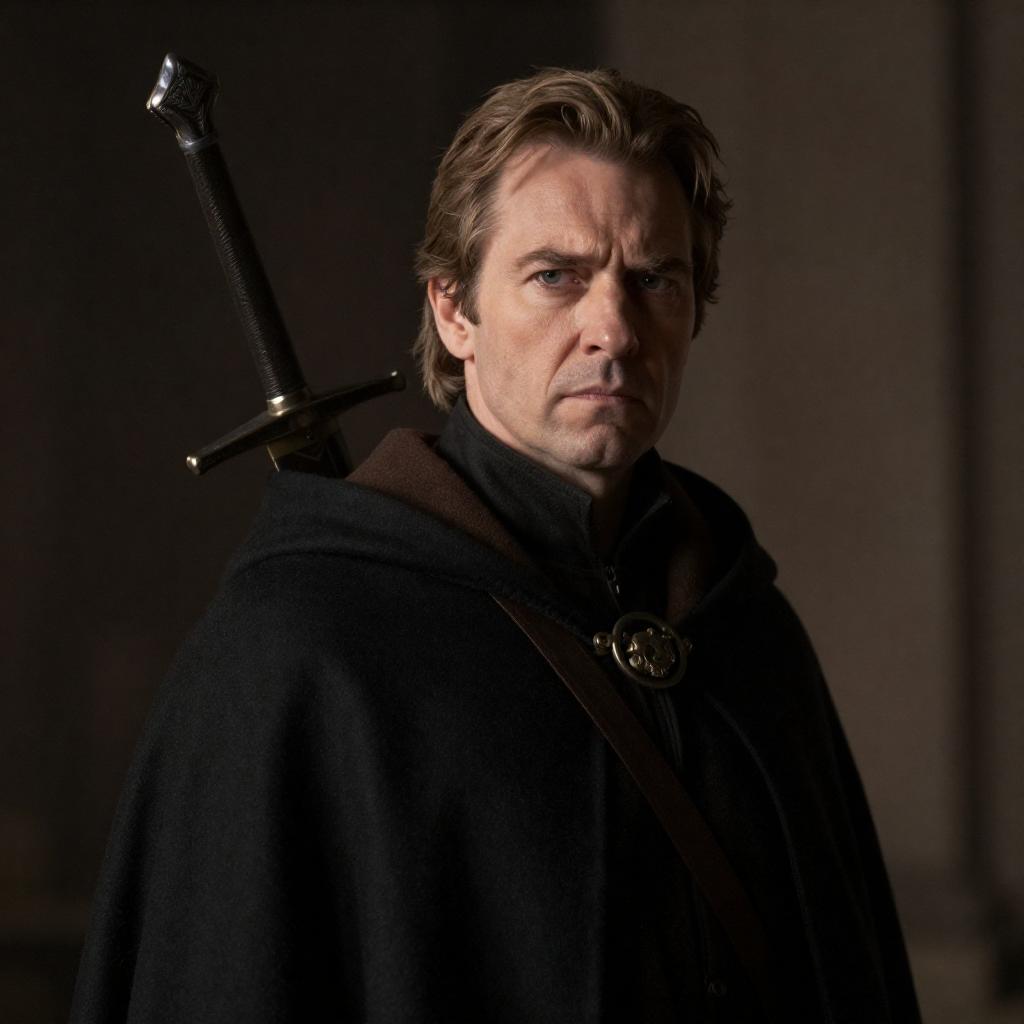 Photograph of a middle-aged man with grey hair and beard, intense expression, wearing fur cloak, holding sword on left shoulder. Background is overcast. Wind blows hair to right. Close-up shot.
