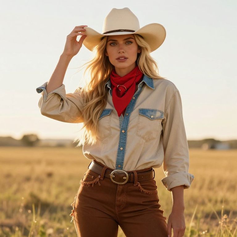 A vibrant female cowboy girl with long, flowing blonde hair that catches the sunlight, wearing a classic cowboy hat tilted slightly to one side, a loose-fitting beige shirt with a faded denim collar, a bright red scarf wrapped around her neck, and sturdy brown pants with frayed edges that add a rugged, lived-in charm. She stands confidently in a sun-drenched open field, the golden hour lighting her face with warmth, her eyes bright with determination and a touch of wild freedom, embodying the spirit of the American frontier with a modern, bold twist.