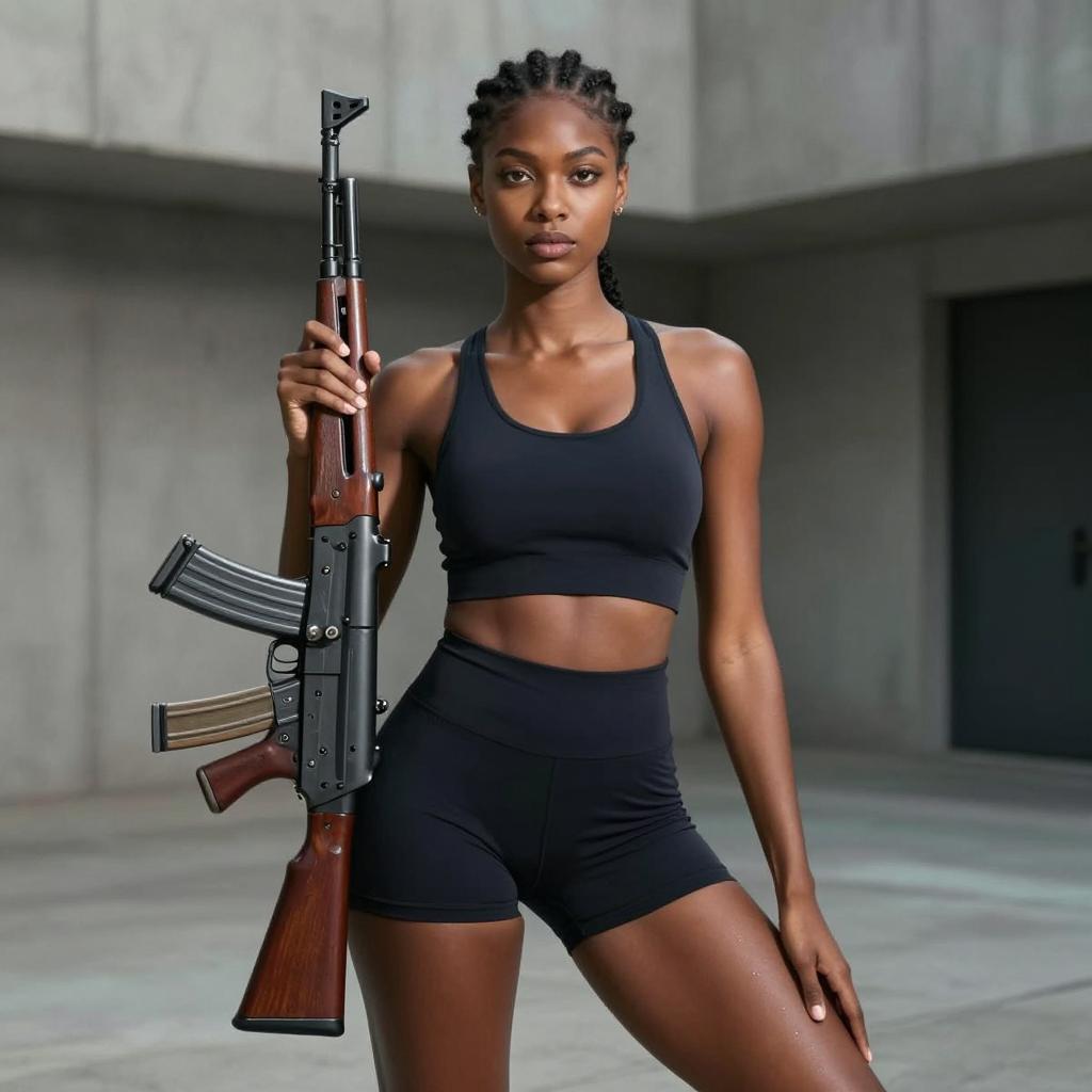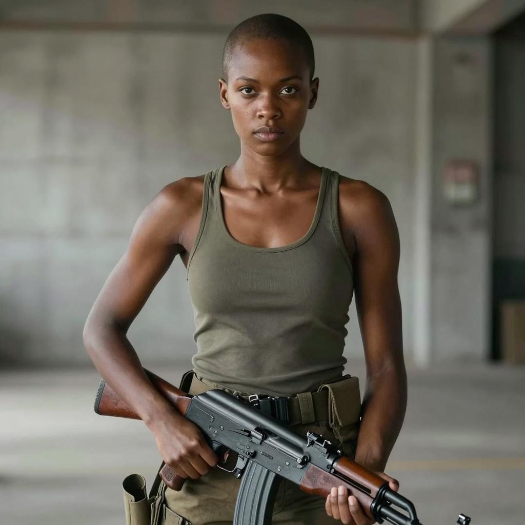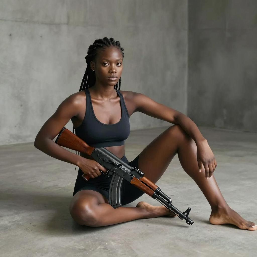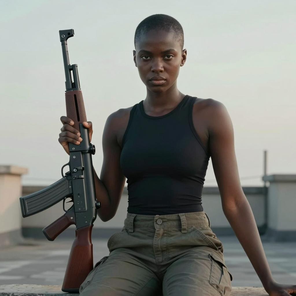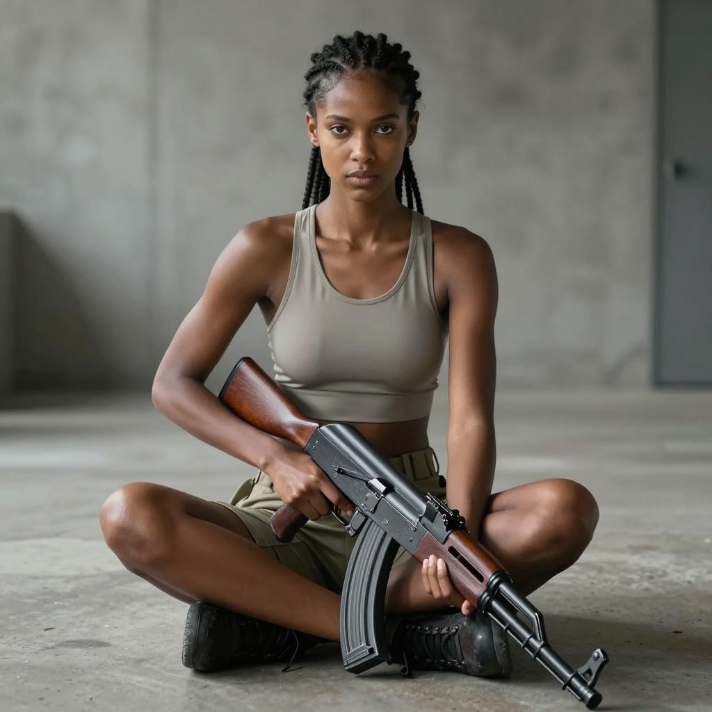 Woman with ak-47 gun, stylized non-violent portrait, dark-skinned woman with shaved sides and intense eyes wearing simple tank top and utility belt posed resting both hands on the rifle laid across her thighs in urban training area with blurred concrete walls, cinematic dramatic lighting, high resolution, ultra-detailed, no blood, no gore