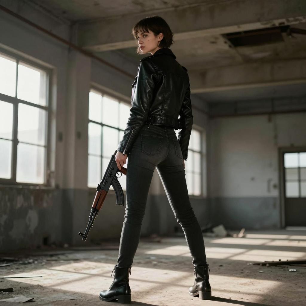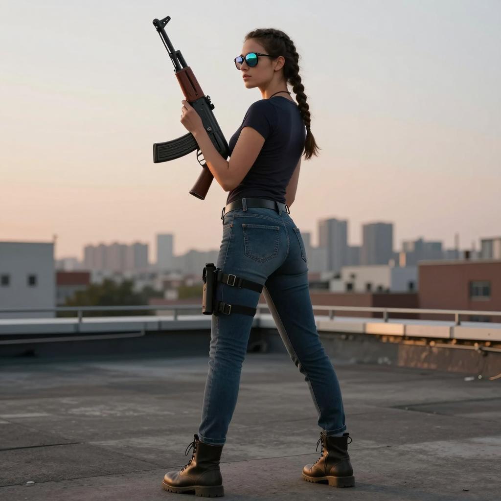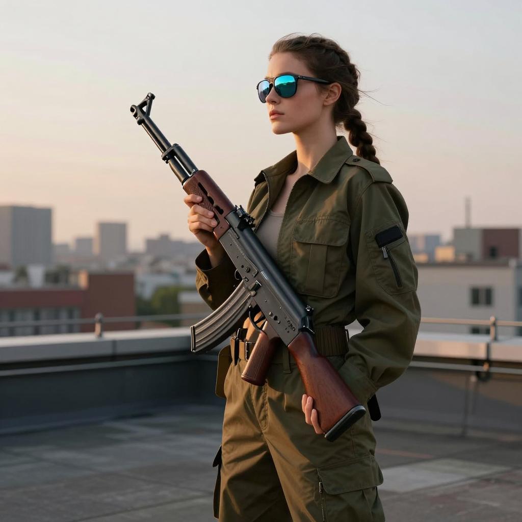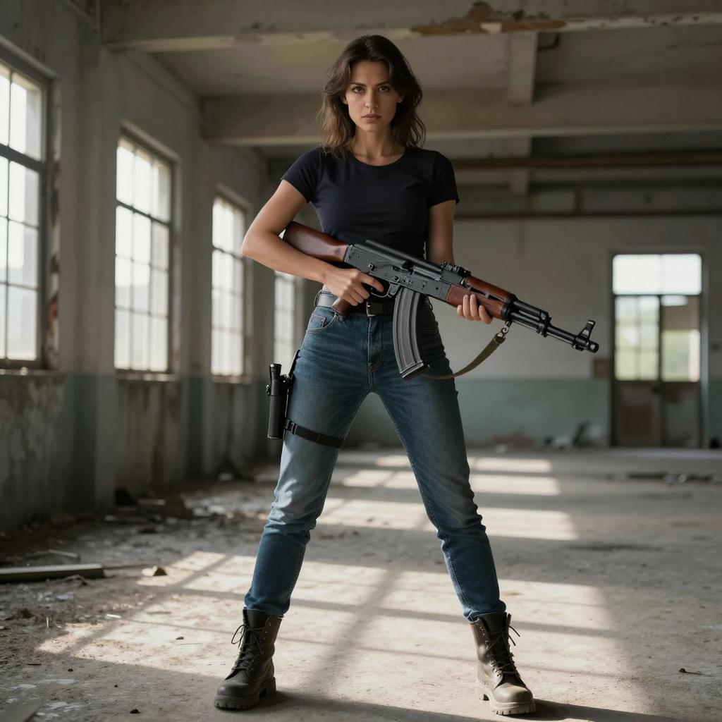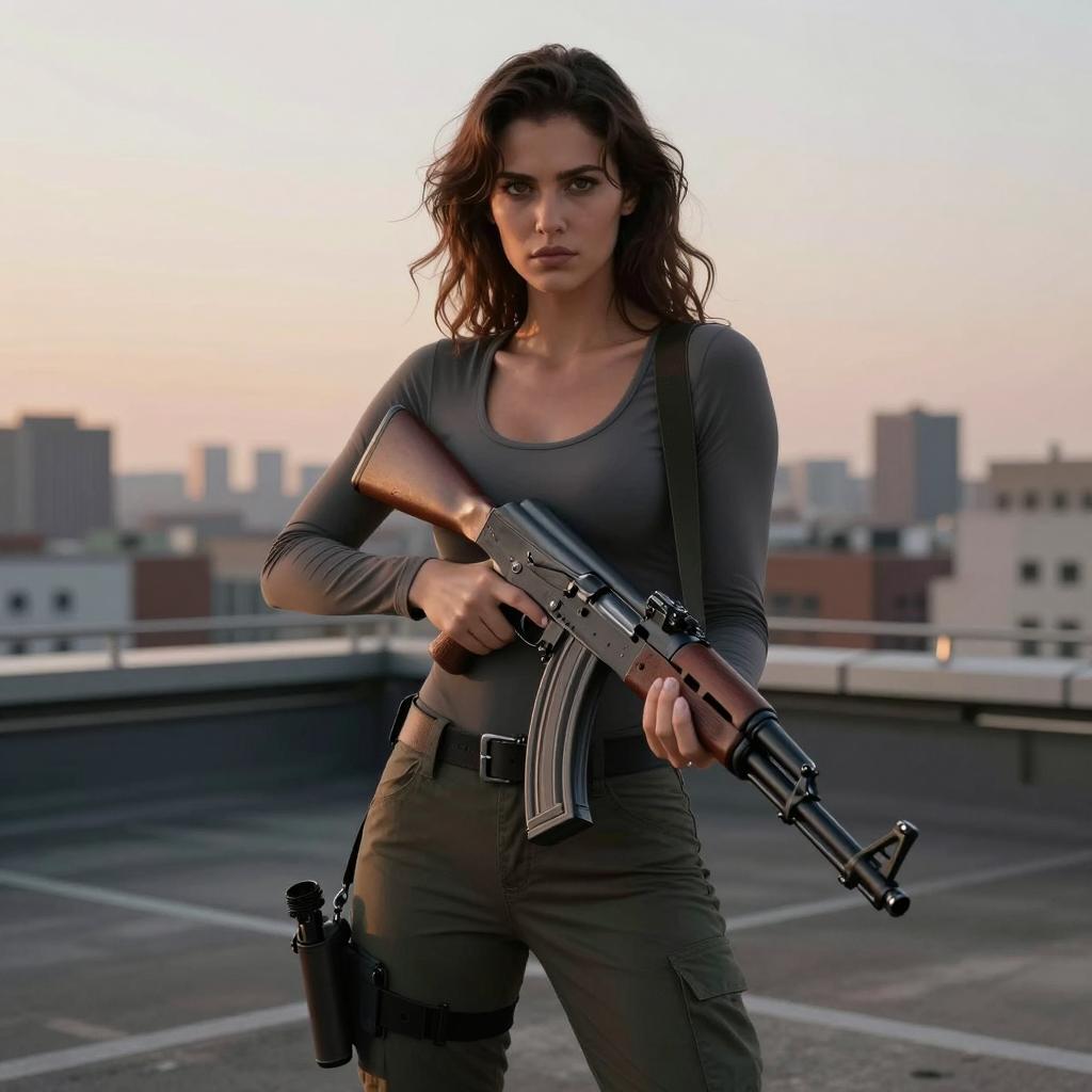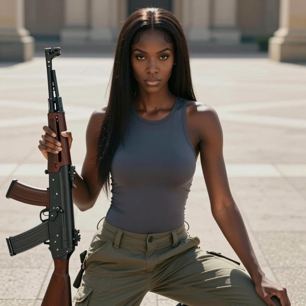 Woman with ak-47 gun, stylized non-violent portrait, dark-skinned woman with shaved sides and intense eyes wearing simple tank top and utility belt posed resting both hands on the rifle laid across her thighs in urban training area with blurred concrete walls, cinematic dramatic lighting, high resolution, ultra-detailed, no blood, no gore