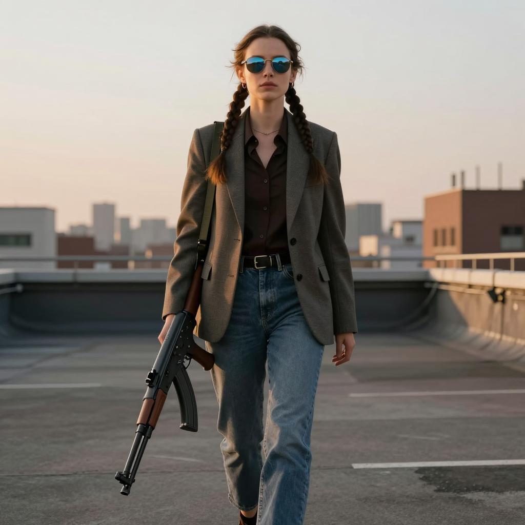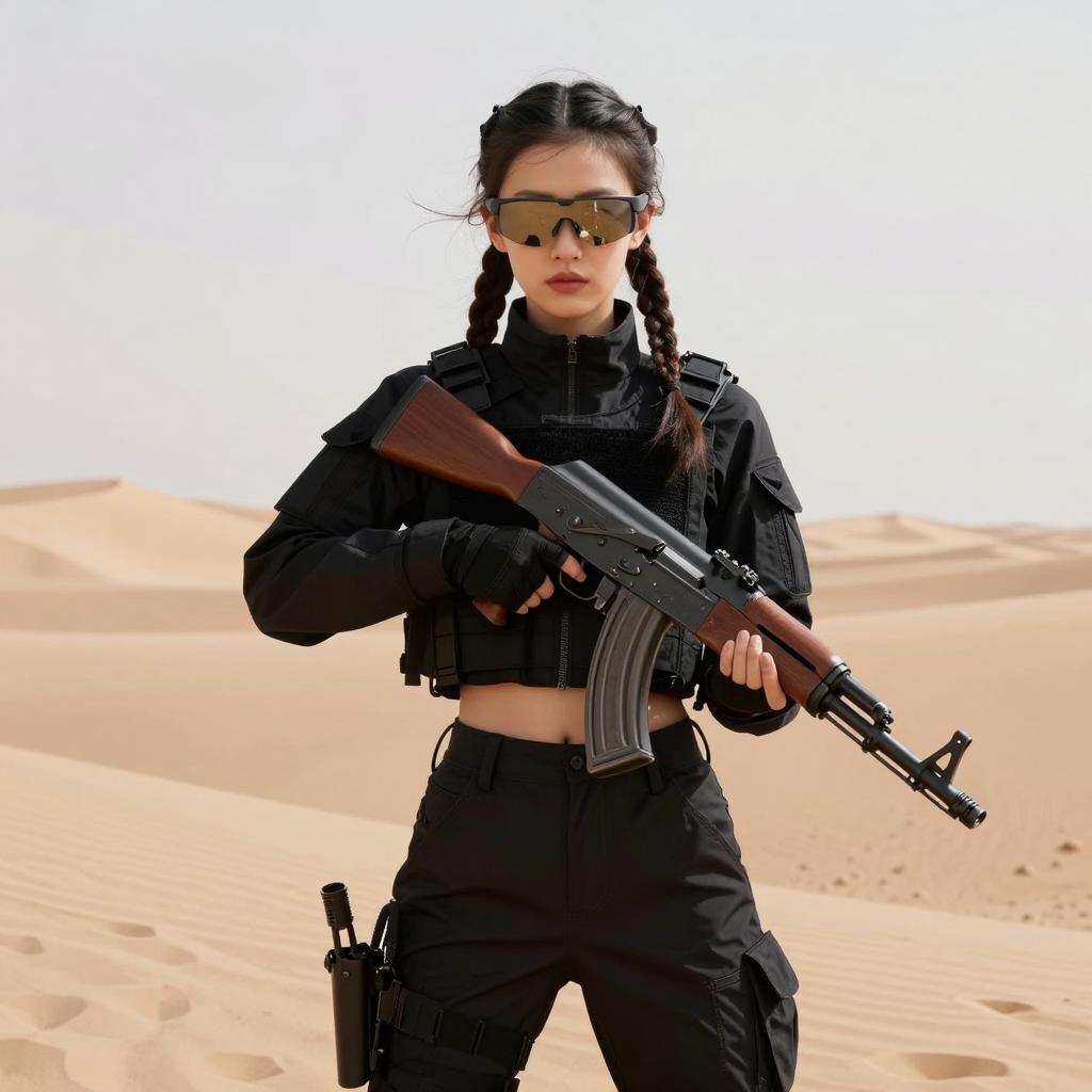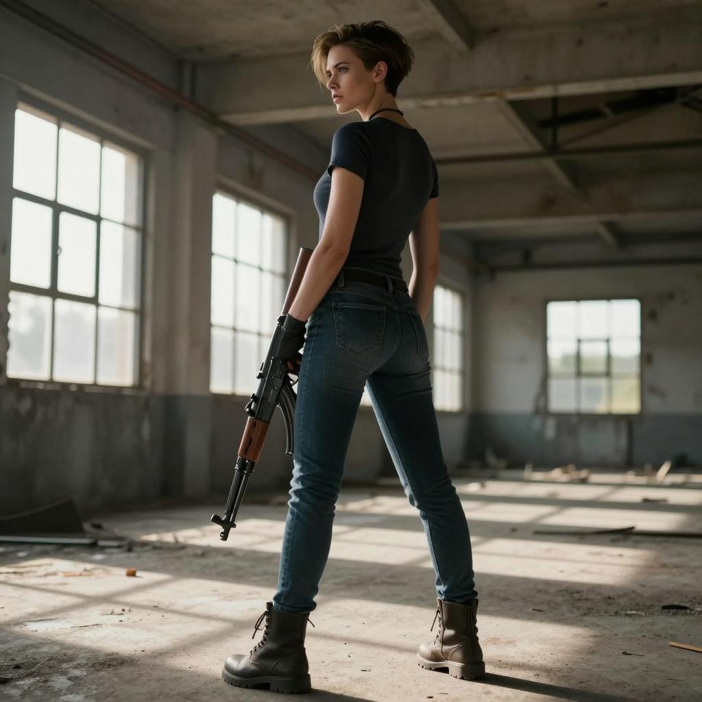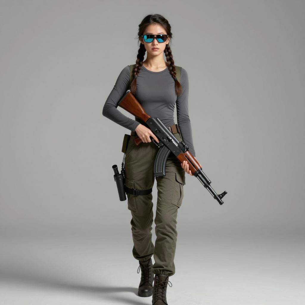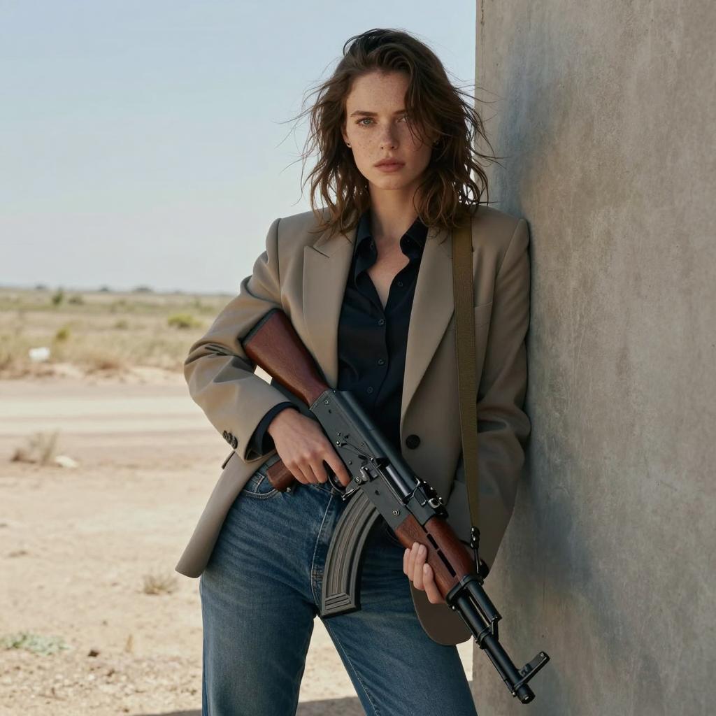Woman with ak-47 gun, stylized non-violent portrait, dark-skinned woman with shaved sides and intense eyes wearing simple tank top and utility belt posed resting both hands on the rifle laid across her thighs in urban training area with blurred concrete walls, cinematic dramatic lighting, high resolution, ultra-detailed, no blood, no gore