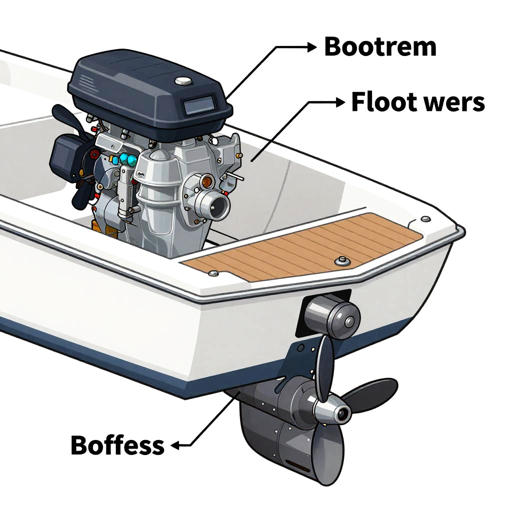 Boat parts labeled, close-up diagram of a motorboat showcasing engine, hull, propeller, rudder, and deck, clean vector style with bold labels and arrows