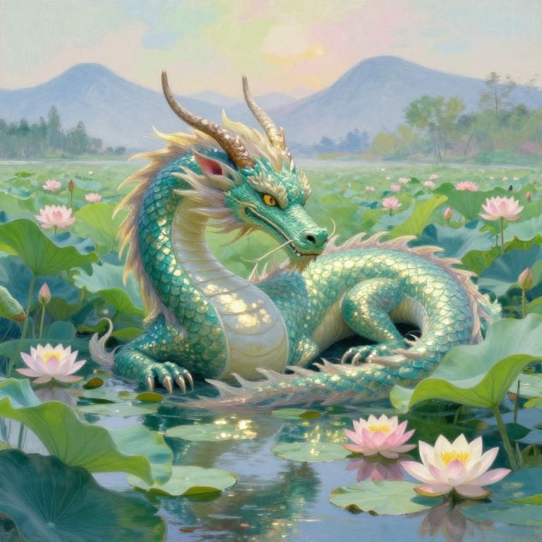 A serene digital artwork captures a majestic dragon peacefully resting in a tranquil lotus pond, its shimmering scales reflecting dappled sunlight through the water lilies. The dragon's wise eyes reveal a profound sense of tranquility as it harmoniously coexists with nature, while the surrounding landscape transitions from vivid greens of the lotus blossoms to gentle hues of the distant mountain range, evoking both awe and serenity in this mesmerizing fusion of mythical wonder and natural beauty, reminiscent of Monet's delicate brushstrokes on his Water Lilies series.