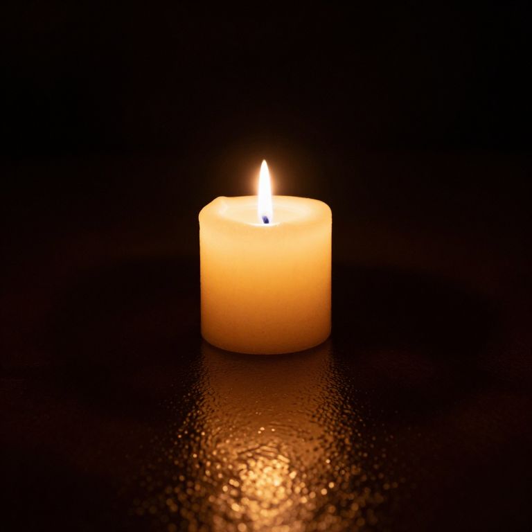 Single candle flickers steadily in the center of a darkened expanse, its warm glow illuminating a textured surface below while casting subtle reflections that shimmer like liquid gold.