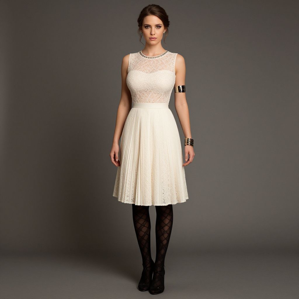 "Woman, romantic style, sleeveless lace dress in cream, fitted bodice with a sheer overlay, jewel neckline, pleated A-line skirt, above-knee length, black patterned sheer tights, black strappy open-toe heels, multiple bangle bracelets, one larger cuff bracelet on upper arm, stud earrings, hairstyle is an updo with wisps of. Sexy. Pretty face and beаutiful eyes. Big breasts."