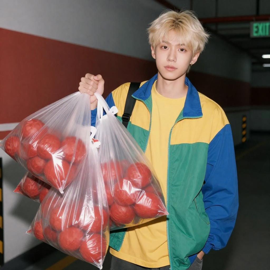 Photograph of a young man with short, platinum blonde hair and fair skin, wearing a colorful jacket with yellow, green, and blue panels, and a yellow shirt. He holds multiple large, transparent plastic bags filled with red items in his left hand. He stands in a dimly lit indoor setting with a red and white wall, and a sign with "EXIT" in the background.