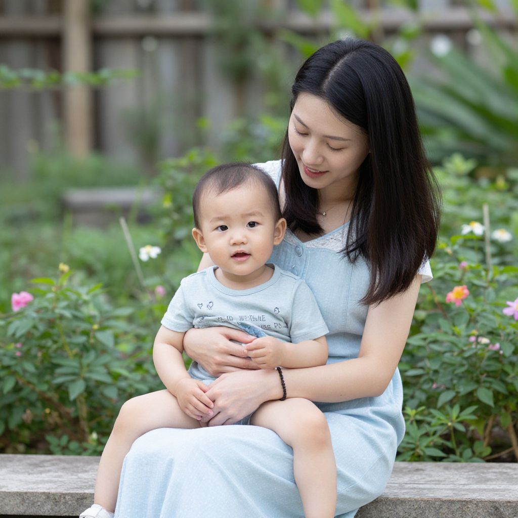 Photograph of an East Asian woman with long black hair, wearing a white dress, sitting on a concrete bench in a garden. She is holding a baby boy with short black hair, dressed in a white shirt and light blue shorts. The baby looks slightly to the left with a neutral expression. The background features green foliage, small pink and white flowers, and a wooden fence. The woman is smiling gently, her right arm wrapped around the baby's waist, and her left hand resting on his leg. The image is brightly lit with natural light.