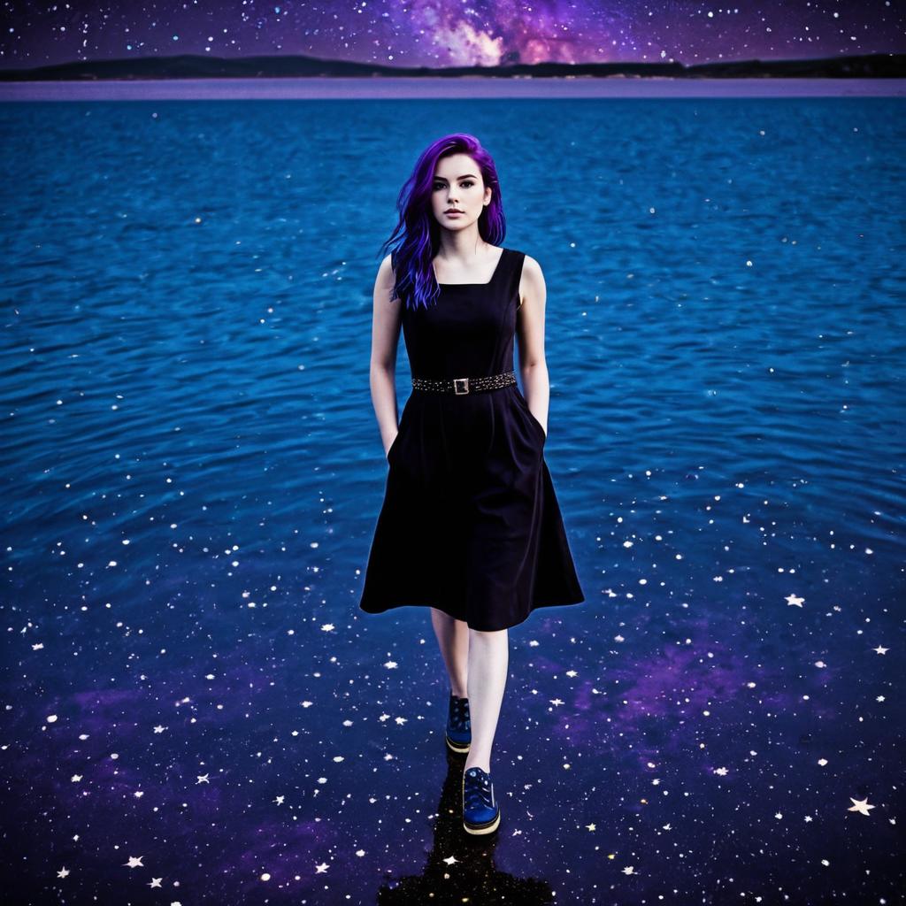 Photograph of a young woman with long, vibrant purple hair standing in a reflective blue lake at night. She wears a sleeveless, black, knee-length dress with a belted waist and black ankle boots with yellow accents. Her hands are in her dress pockets. The background features a starry night sky with a galaxy-like cluster of purple and pink stars above the horizon. The water is calm, with small ripples reflecting the starry sky and her silhouette. The overall color palette is dominated by blue and purple hues, creating a surreal, cosmic atmosphere.