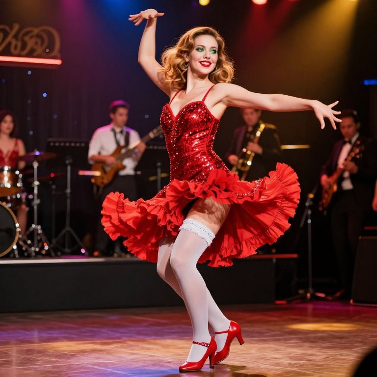 A vibrant French can-can dancer in her late 20s with golden brown hair, bright red lips, and mischievous green eyes, wearing a sequined red dress with dramatic frills, frilly white stockings, and bold red heels, performing on a lively 1920s Parisian club stage with flashing lights and a live band in the background, full of energy and playful motion.