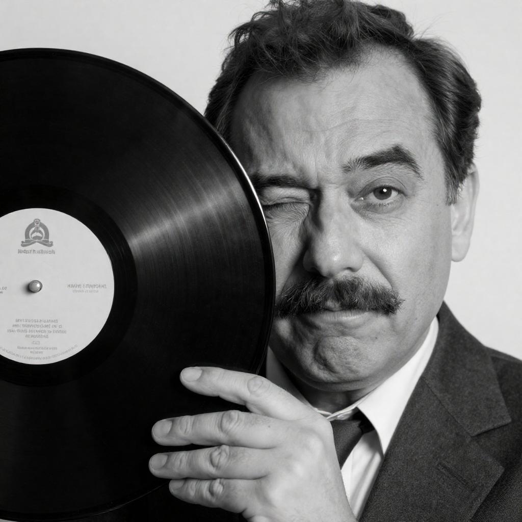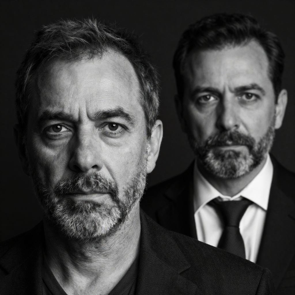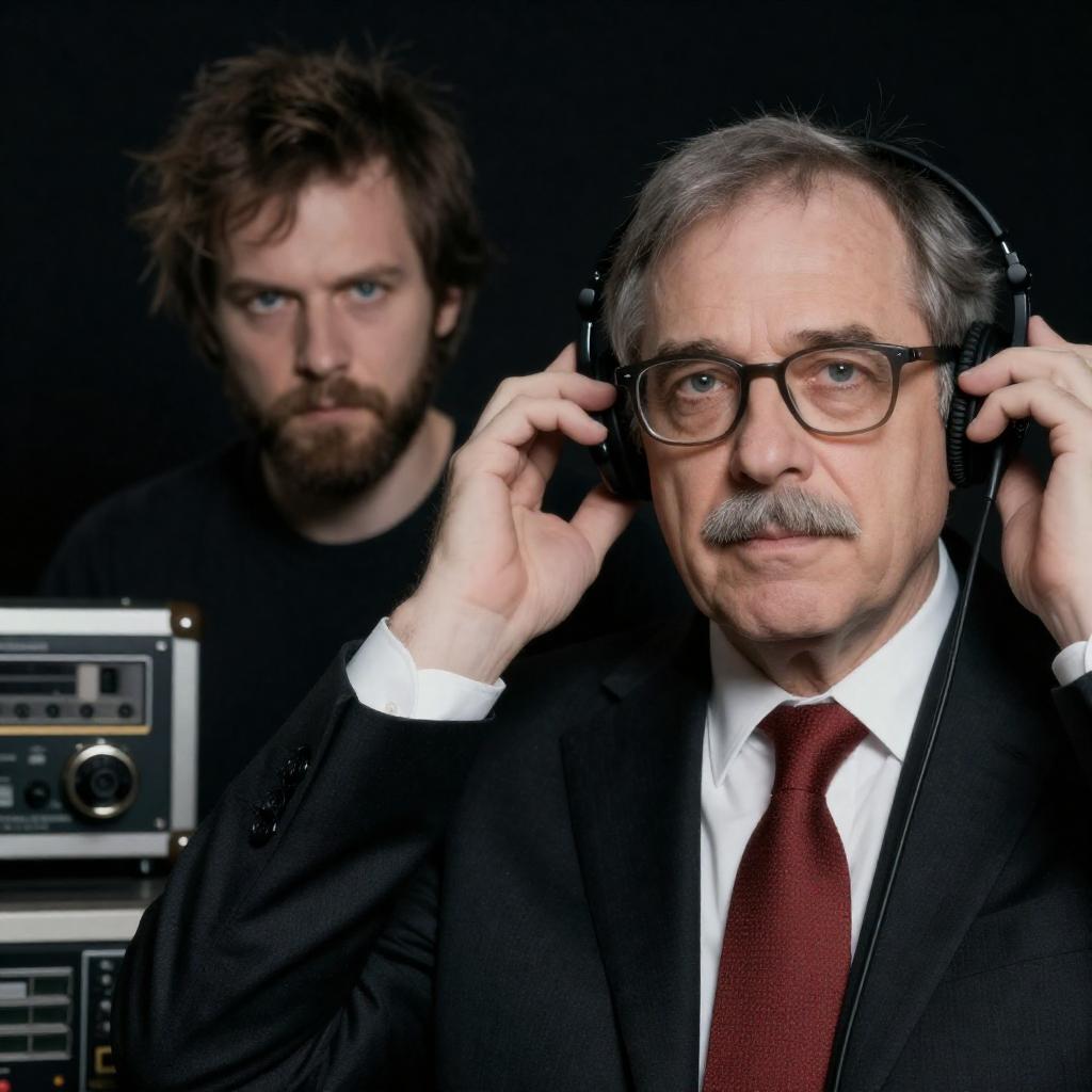 Photograph of two men. Older man with glasses, mustache, red tie, black suit, adjusting radio headset. Younger man with messy brown hair, beard, intense expression, in background. Dark setting, audio equipment visible. Older man's hands on headset.