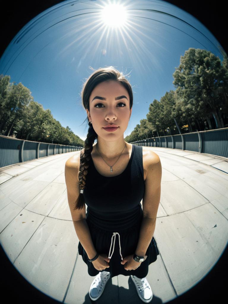 Close-up fisheye lens photo of a young woman wearing an intricate patterned bohemian blouse with deep colors and oversized round black sunglasses. She has light brown hair and is posing casually outdoors near a circular tiled structure on a sunny day with a clear blue sky.
