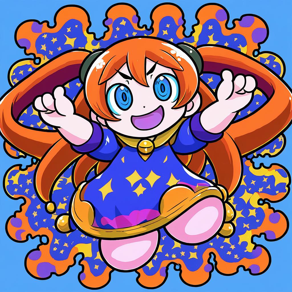 This is a vibrant digital drawing in a chibi anime style. It features a cheerful, cartoonish girl with large blue eyes, orange twin pigtails, and a wide smile. She is wearing a blue dress adorned with yellow stars and a yellow collar with a bell. Her arms are raised in a joyous gesture. The background is a bright blue with orange and yellow star-shaped patterns surrounding her. Her outfit and hair have a fiery, dynamic quality, adding to the energetic feel of the image. The overall style is playful and exuberant.