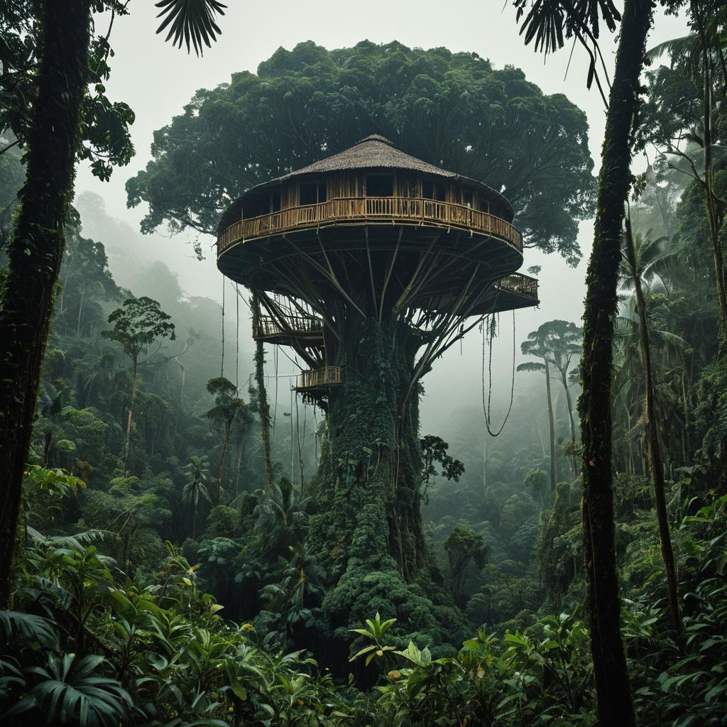 A large, circular wooden treehouse elevated above the ground on a thick tree trunk covered with moss and vines, set in a dense tropical rainforest. The treehouse features a balcony surrounded by lush green foliage and is enveloped in mist, creating a mystical atmosphere. Tall trees with broad leaves surround the structure on a forest floor filled with various tropical plants. The scene combines natural elements with artistic fantasy, inspired by tropical symbolism and folkloric art styles.