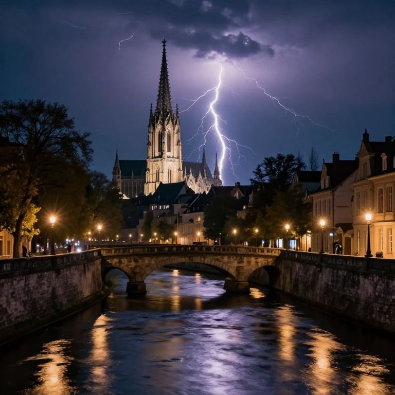 Photograph of a nighttime cityscape featuring a Gothic cathedral with a tall spire illuminated by vibrant lightning bolts against a dark, stormy sky. The cathedral is centered, with a stone bridge arching over a reflective river in the foreground. Warm streetlights line the riverbanks, casting a yellow glow on the buildings and trees. The water in the river reflects the cathedral's lights and the lightning. The buildings on either side of the river are classic European-style with sloped roofs. The overall scene is dramatic and atmospheric, combining natural and architectural elements.