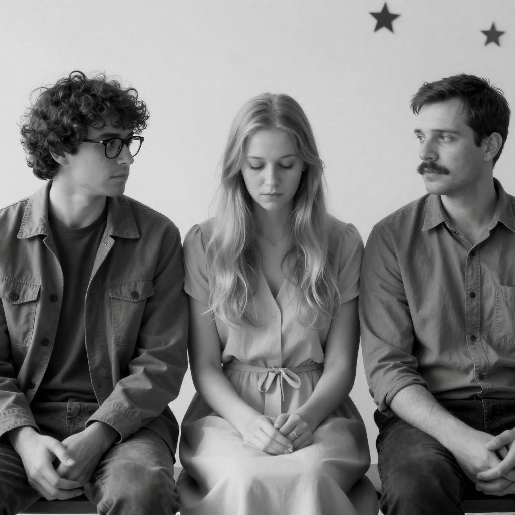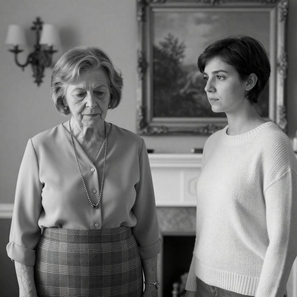 Black and white photograph of three people outdoors. Elderly man with gray hair, dark jacket, and light pants stands left. Young woman with short blonde hair, dark top, and light pants stands center. Young woman with tied-back hair, dark dress, stands right. Elderly man looks down, young women look at him. Background includes house wall, plants. Elderly man's intense gaze, young women's neutral expressions.