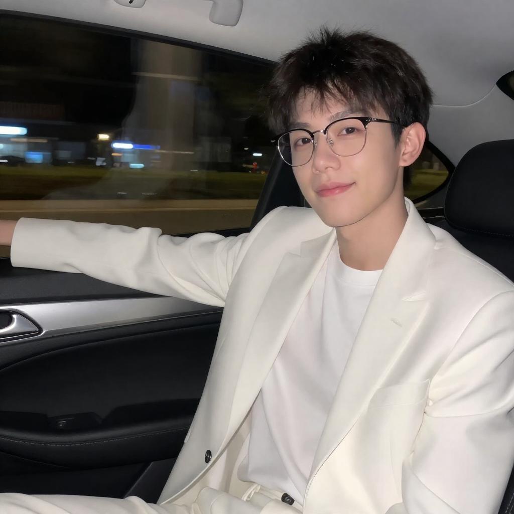 Photograph of a young man with short dark hair and glasses, wearing a white suit jacket over a white shirt, sitting in a dimly lit car at night. His right arm rests on the car door, and he smiles slightly. The background is blurred with city lights.