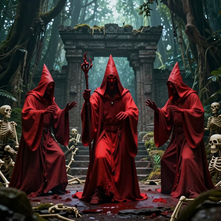 Ink Viscosity three menacing red wizards performing a ritual in ancient ruins in the jungle. Surrounded by skeletons. Cinematic lighting.,