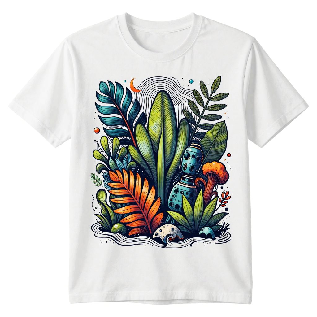 Best AI for t-shirt design illustrating nature-inspired motifs merged with tech elements, intricate linework and fluid organic shapes, delivering elegant and trendy visuals perfect for casual and streetwear apparel in high detail and vivid colors