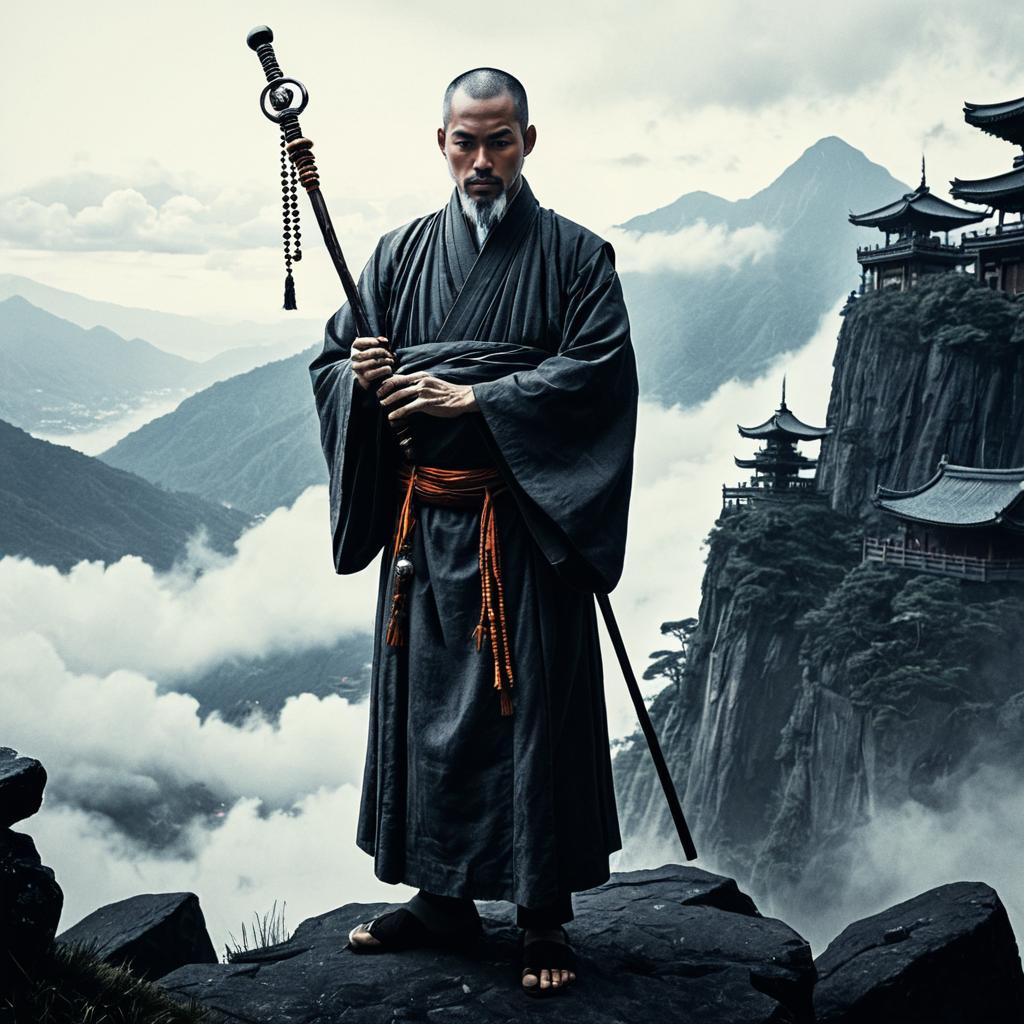 Stoic Monk in Misty Mountain Temple