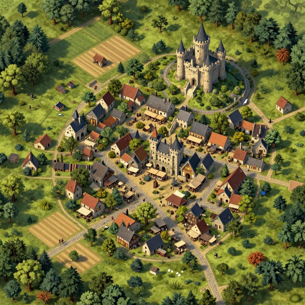 Dnd map generator ai designing a lush medieval village surrounded by farmlands and dense woods, cobblestone streets, market stalls, and a central castle, rendered with vivid details and warm lighting, fantasy cartography style