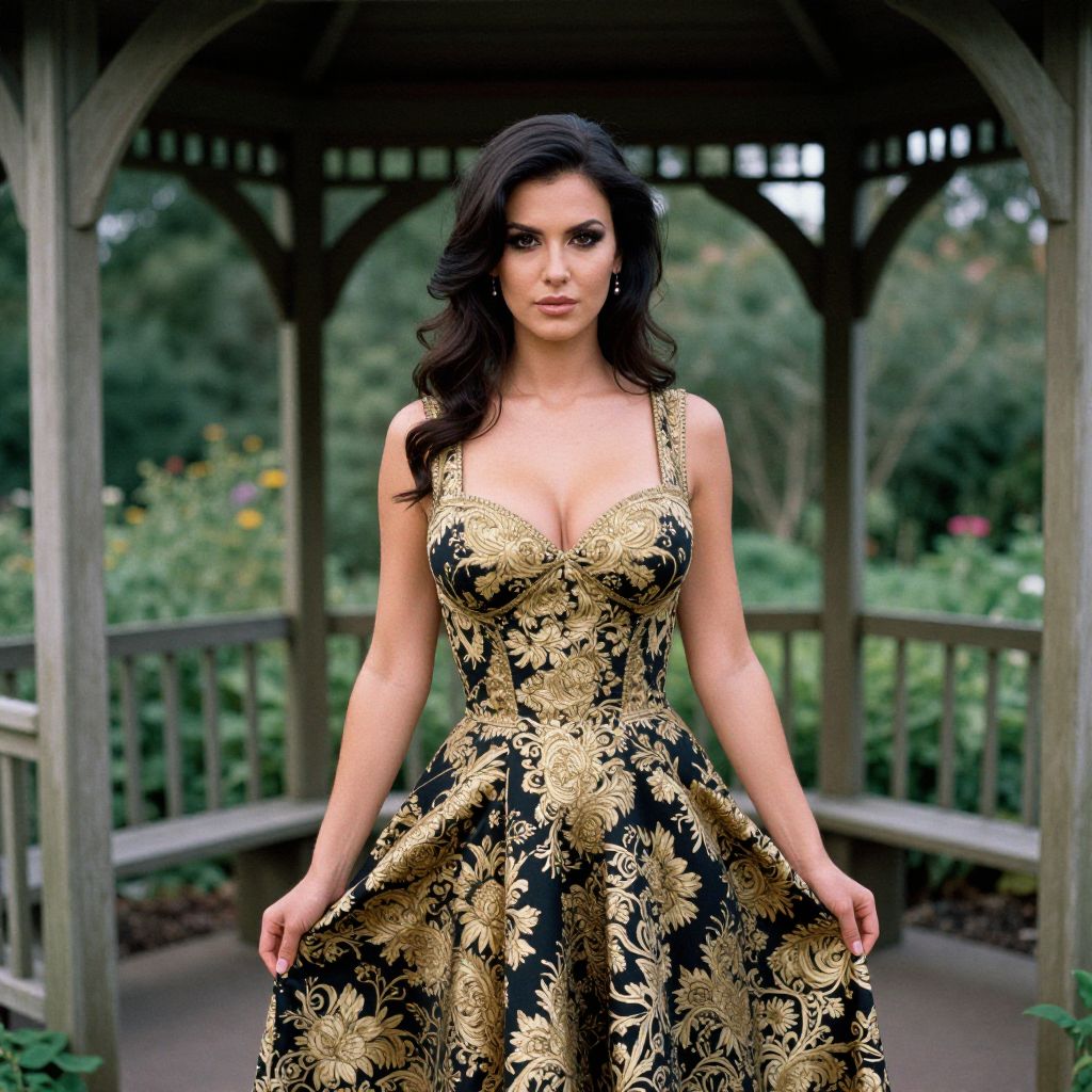 A curvy woman in a bright red strapless bodycon dress with black lace at the waist stands elegantly in a castle courtyard with a garden, holding a black clutch and wearing diamond stud earrings. Visual style: Gottfried Helnwein. Sexy. Pretty face and beаutiful eyes. Big breasts