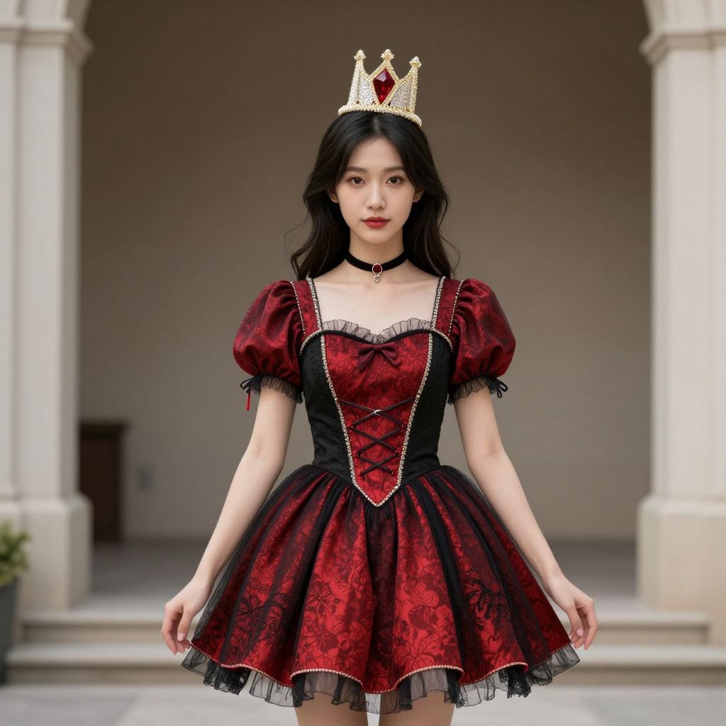 Photograph of an Asian woman with fair skin and long black hair, wearing a red and black Victorian-style dress with puffed sleeves, lace trim, and a black corset. She has a gold crown with red gemstones on her head and a black choker with a red pendant. She stands in front of a beige, stone-columned archway, with a blurred dark brown object in the background. The dress has intricate red floral patterns and a black lace overlay at the skirt's edge. Her expression is neutral, and she stands with arms slightly apart, exuding a regal, princess-like aura.